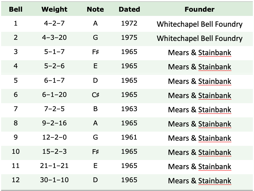 In 1969 the Guild President, the Bishop of Guildford, said he would like to see the ring augmented to 12. This was eventually achieved in 1976 with the construction of the additional frame and the hanging of the two new bells undertaken by Guild members to help defray the cost.